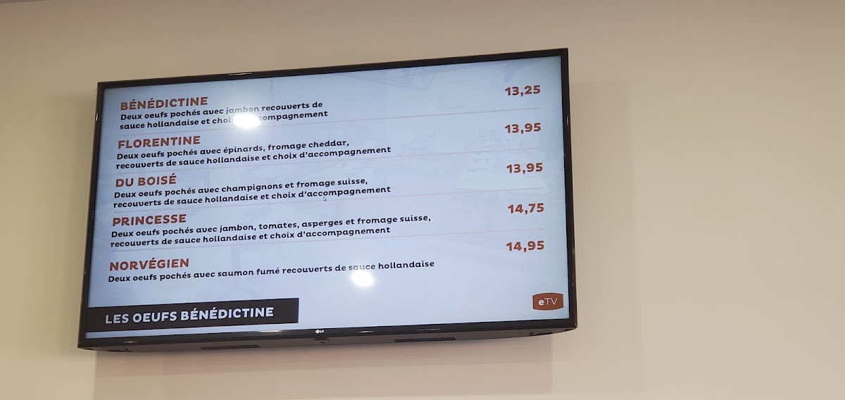 Trois oeufs cuits à votre goût, un choix d’accompagnement avec pommes de terre maison, fruits frais et rôties. Choix d’accompagnement : bacon, jambon, saucisses, bacon de dinde, creton ou fèves au lard. / Three eggs cooked to your liking, one choice of side dish with homemade potatoes, fresh fruit and toast. Choice of accompaniment: bacon, ham, sausages, turkey bacon, creton or baked beans.